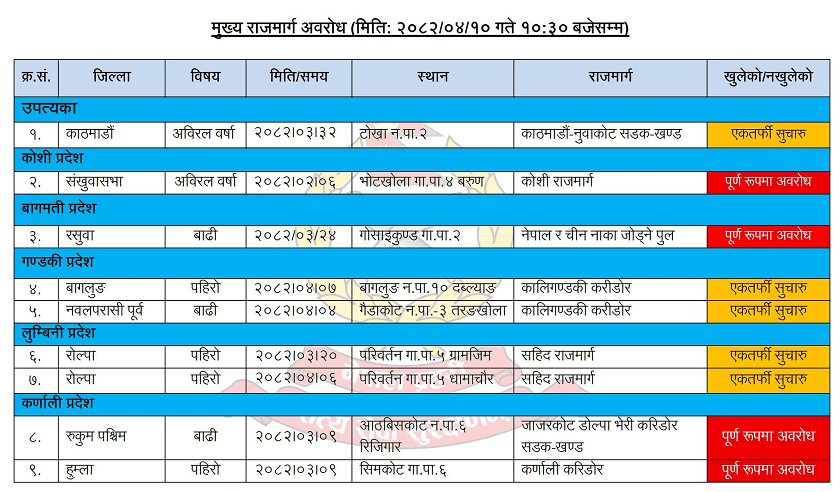 मनसुन सक्रिय भएसँगै बाढी र पहिरोका कारण देशका विभिन्न स्थानका राजमार्गहरू अवरुद्ध भएका छन् । नेपाल प्रहरीले गराएको शनिबार बिहान साढे १० बजेसम्मको अद्यावधिक जानकारीअनुसार ४ वटा सडक पूर्ण रूपमा अवरुद्ध छन् भने ५ स्थानमा एकतर्फी रूपमा सञ्चालनमा छन् ।