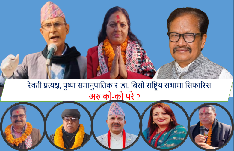 यस्तै राष्ट्रिय सभामा पुर्व सांसद डा. राम बहादुर बिसी, पुर्व पार्टी सभापति तथा जिल्ला समन्वय समितिका पुर्व सभापति पिताम्बर शर्मा भुसाल र नेपाली कांग्रेसका पुर्व केन्द्रिय सदस्य बालकृष्ण पाण्डे सिफारिस भएका छन् ।